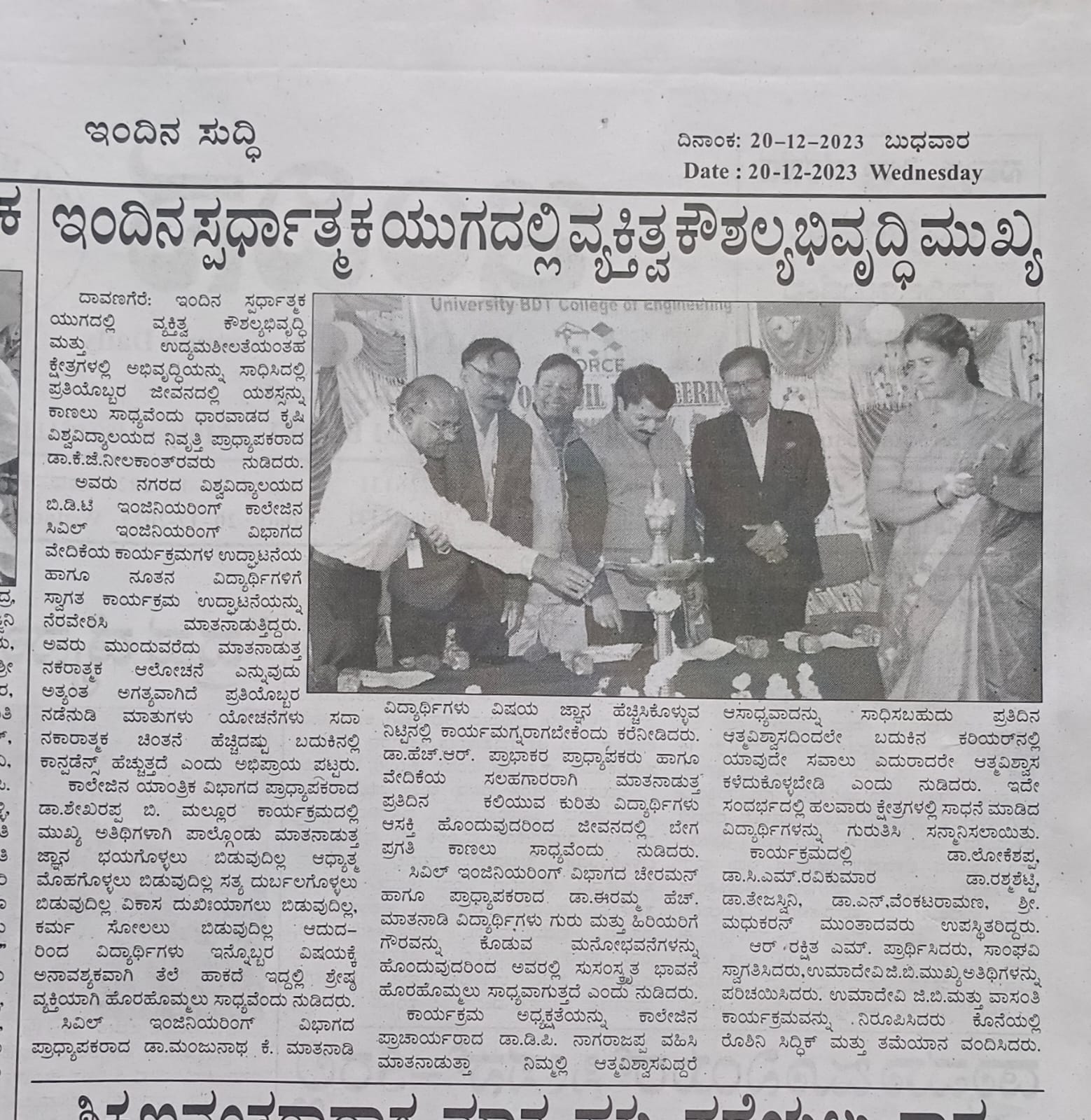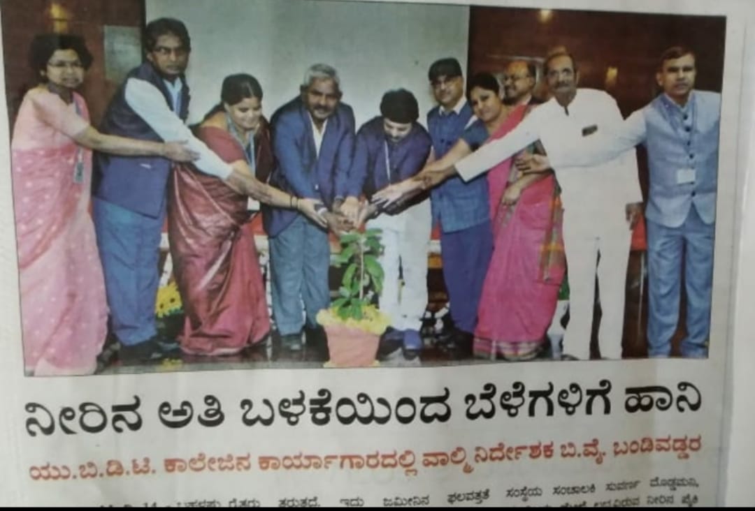 | 5 | One Day Workshop on IRRIGATION MANAGEMENT and CONSERVATION OF WATER BODIES | 14-12-2023, R & D Block, UBDTCE, Davanagere | 100 |